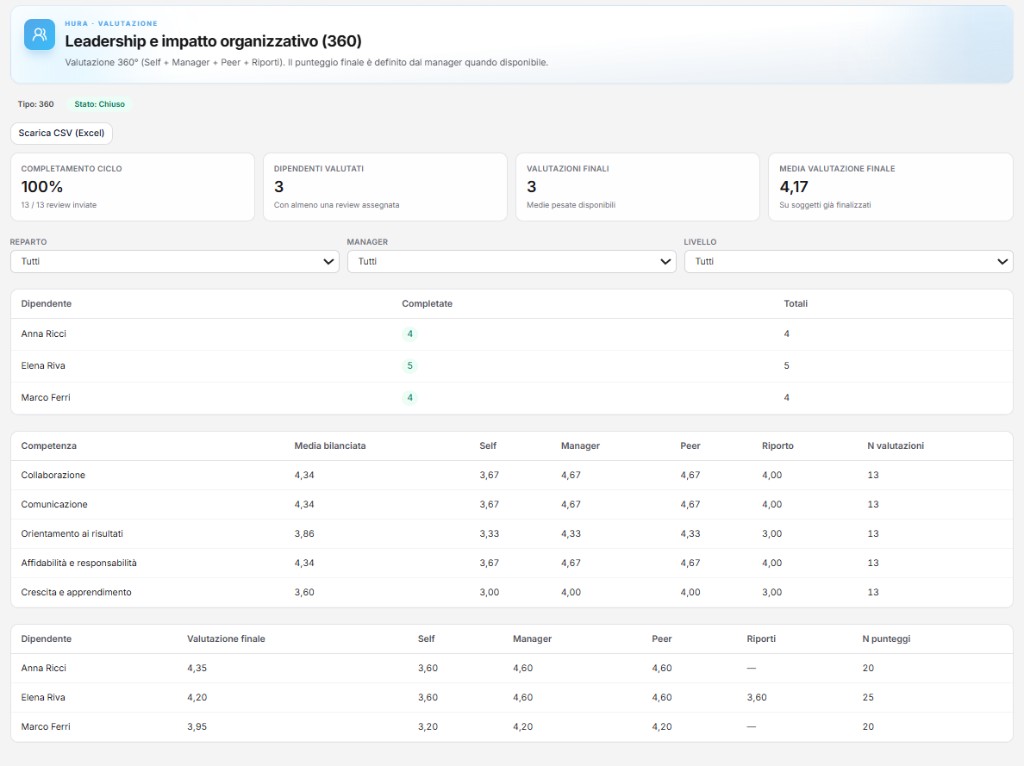 Con un modello condiviso, HR e manager confrontano risultati e comportamenti in modo ripetibile. La lettura non dipende da fogli separati o criteri locali difficili da spiegare.